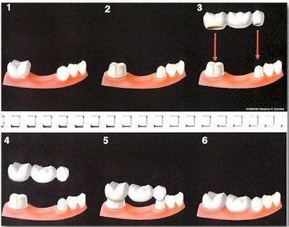- Cầu răng, tương tự mão răng, có thể được làm bằng sứ, kim loại quý (vàng), hoặc kết hợp của hai loại trên.